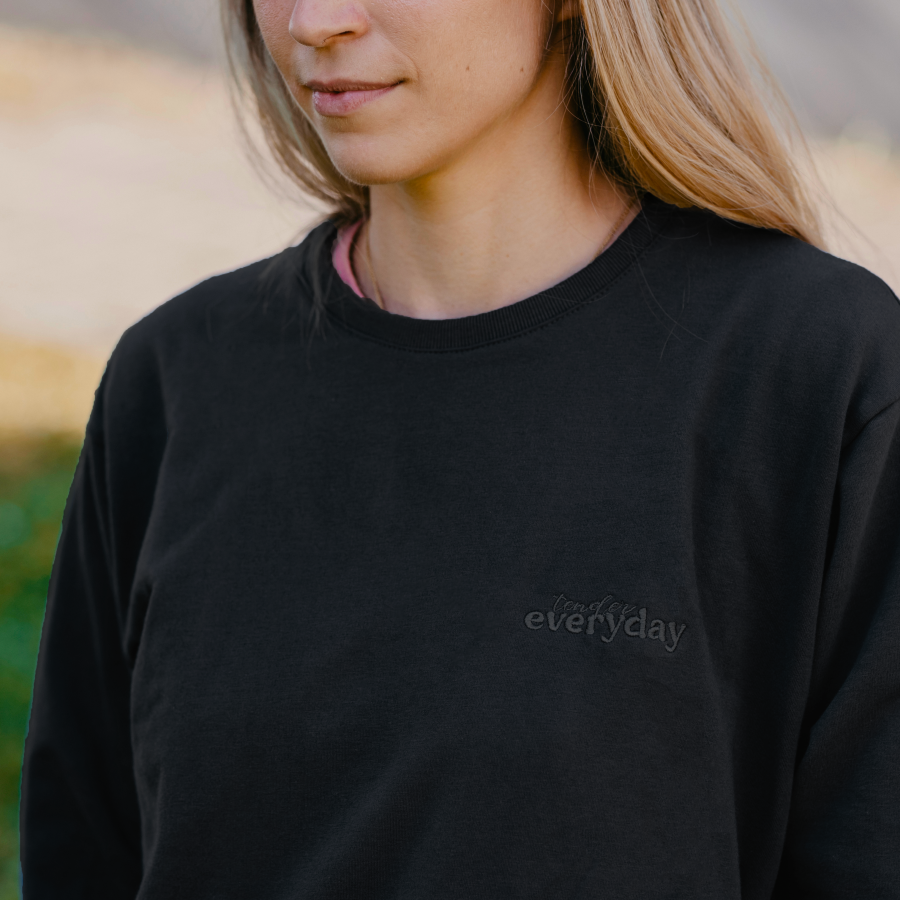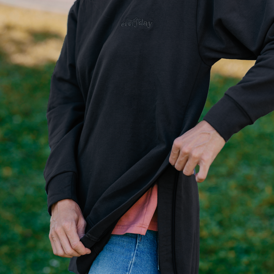 Mäkučká oversized mikina v čiernej farbe pre všetky milovníčky pohodlia a zakrytých zadkov 😀 Vo verzii s výšivkou alebo Basic bez výšivky (vhodná na personalizovanú výšivku – nezabudnite si ju pridať do košíka).